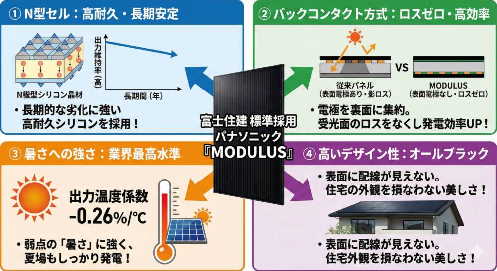富士住建の太陽光パネルは、パナソニック製の最上位モデルである「MODULUS(N型バックコンタクト)」が標準仕様です。