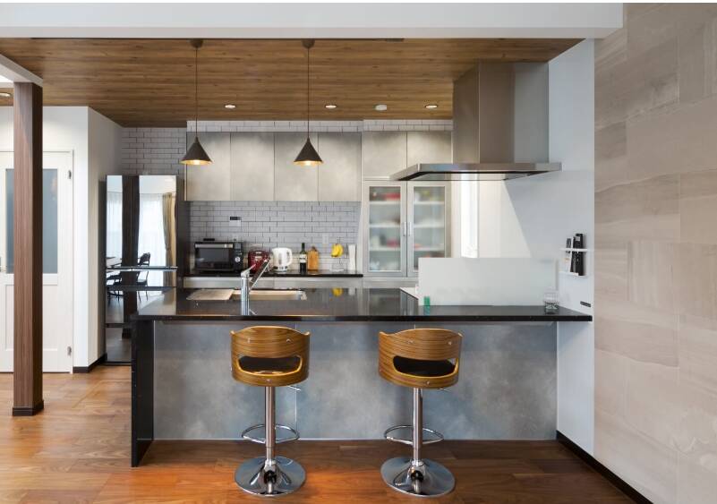- ペニンシュラ型フルフラットキッチンで、開放感がデザイン性がある
