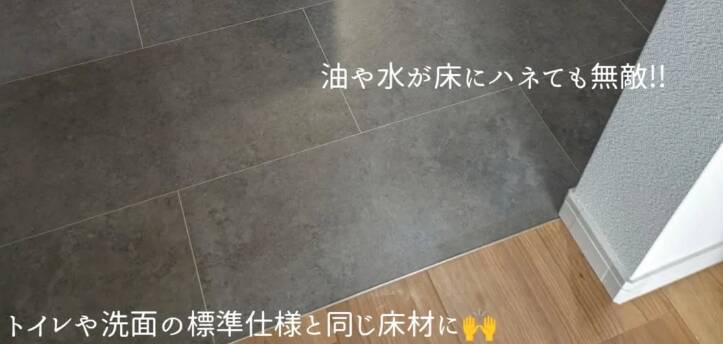 満足度が高い理由: 水や熱に強いため、キッチンマットなしでも生活できるのが最高!キッチンだけ床材を変えることで、リビングとのゾーニング(空間分け)ができ、デザイン上のアクセント効果も期待できます
